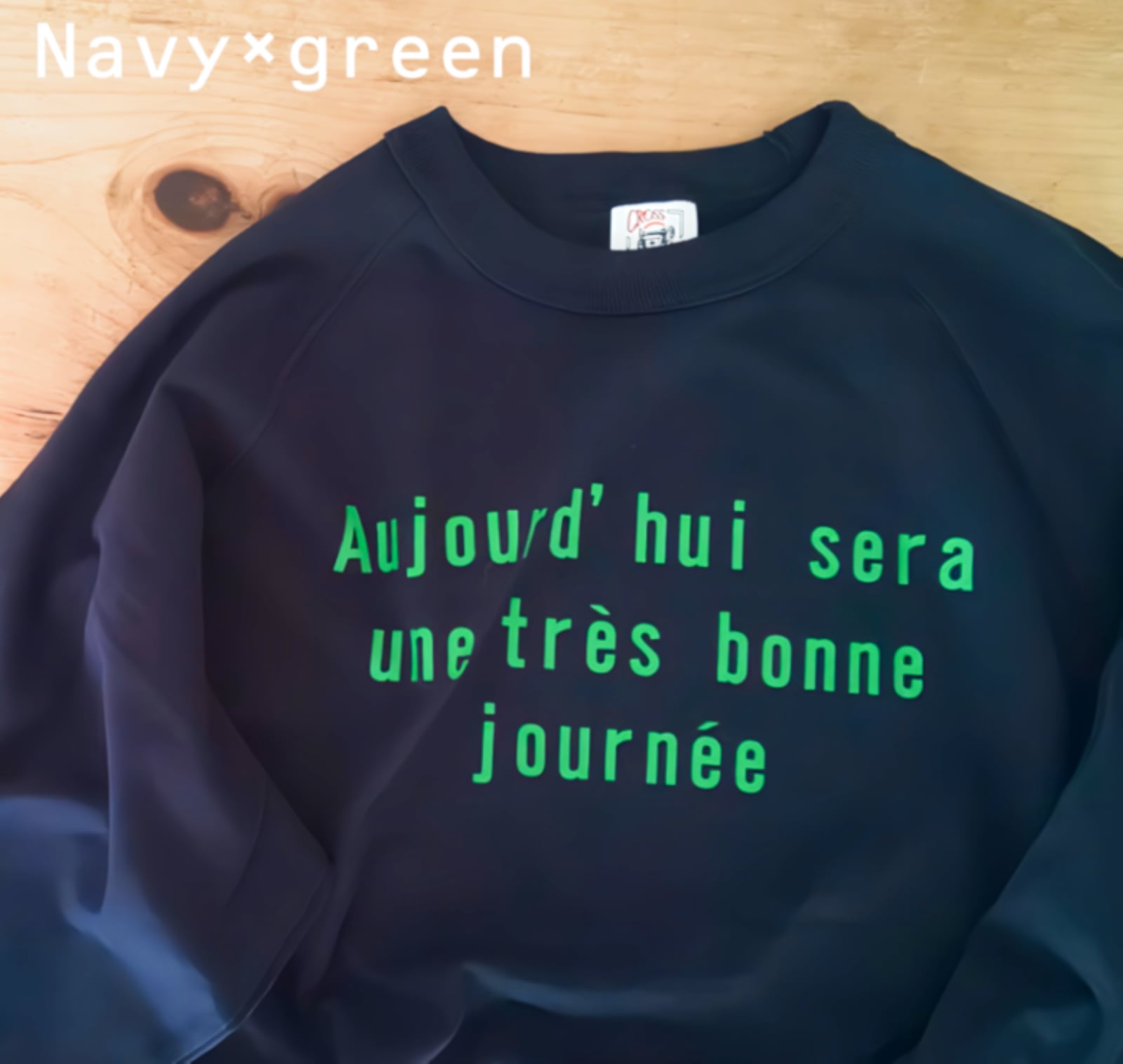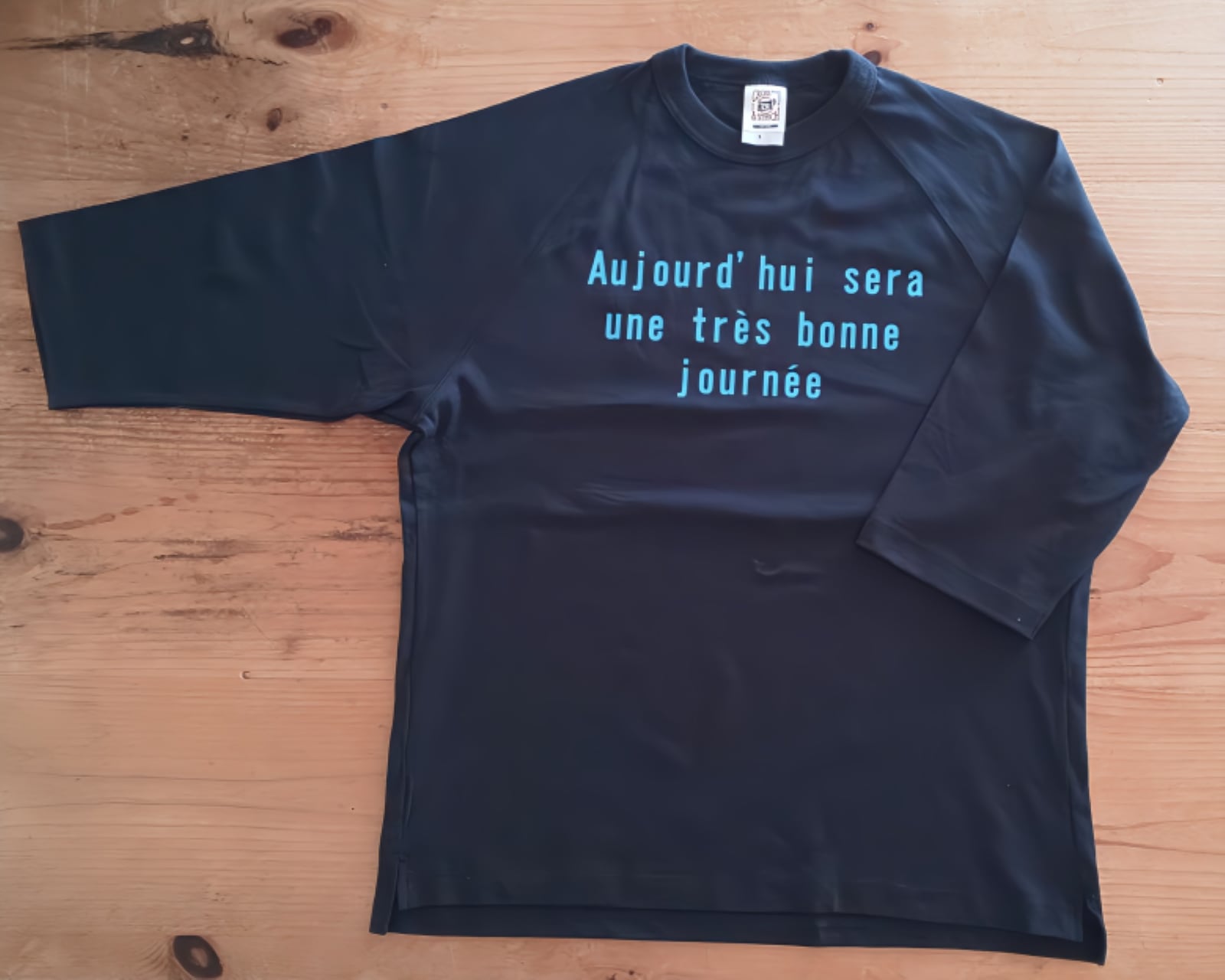 「今日はとても良い一日になる」という意味のフランス語をプリントしたTシャツです。