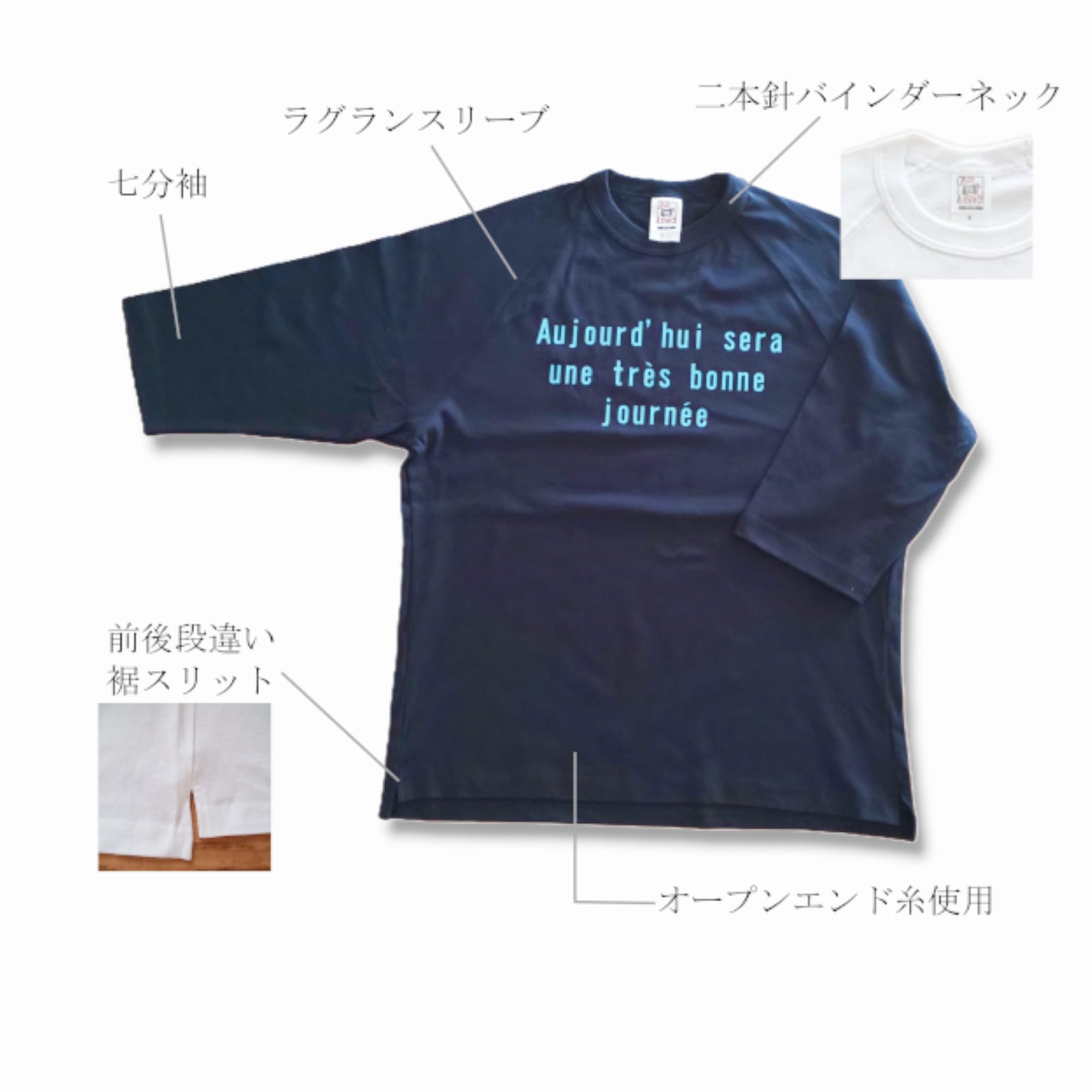 (再販)送料無料*ラグラン7分袖リラックスフィット ネイビーTシャツ〈文字2色展開〉*今日はとても良い一日になる *ユニセックス