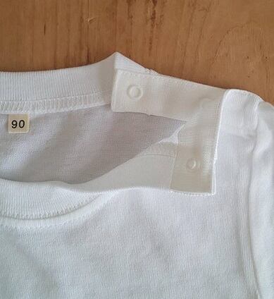 *80サイズと90サイズの2サイズ展開で肩にスナップボタンが付いています。