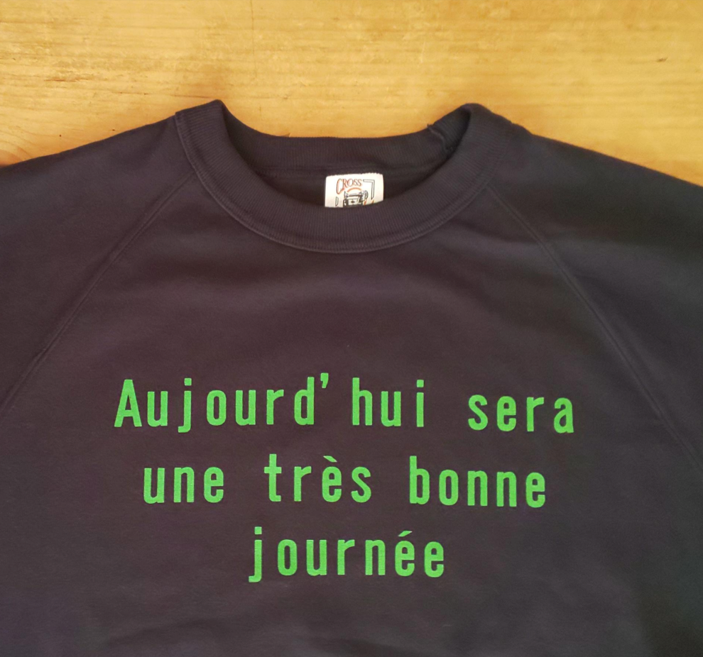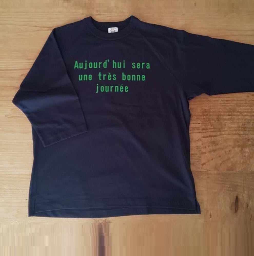 「今日はとても良い一日になる」という意味のフランス語をプリントしたTシャツです。