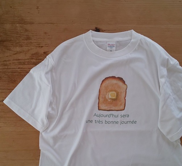 ご覧いただきまして、ありがとうございます。 *とっても美味しそうなバタートーストのイラストがプリントされたユニークなTシャツです。 *イラスト下には「今日はとても良い一日になる」という意味のフランス語の文章をプリントしました。 *生地は5.6オンスの程良い厚みで、肌触りの良いコットン素材です。 *プリント方法はインクジェットプリントで専門のプリント工場に依頼しました *ゆったりとしたオーバーサイズシルエットはユニセックスで着用いただけます。 また、リラックス感のあるシルエットですのでルームウエアとしてもご活用いただけます。 ※必ずサイズをお選びください。 -------------------------------------------------------- ●Tシャツ本体:Printstar 5.6オンス 綿100%(VIETNAM) ●プリント:インクジェットプリント (JAPAN) ●サイズ:画像のサイズ表をご覧ください。 ※Tシャツ本体のメーカー記載のサイズです。多少の寸法誤差はご了承下さい。 ●サイズ感:男女兼用のオーバーサイズシルエットになります。 ※お持ちのTシャツ等と比較してからのご購入をおすすめします。 ※写真のTシャツはすべてSサイズです。 ------------------------------------------------------- 【ご購入時の注意点】 ー必ずお読みくださいー 以下、あらかじめご理解の上、ご購入くださりますようお願いいたします。 ・プリントは多少の位置ずれ・傾き・スレ等ある場合がございます。 ・プリントの色に関しては個体差、ロット差がある場合がございます。 ・洗濯は裏返してネットに入れることをおすすめしております。 ・漂白剤、蛍光増白剤入りの洗剤は使用しないでください。 ・ドライクリーニング、タンブラー乾燥はお避けください。 ・プリント部分には直接アイロンを当てないでください。 ・プリント面とプリント面を重ねて保管しないことをおすすめしております。 ・摩擦や汗等により変色や色落ち、他の物から色移りする場合がございます。 ・お客様のご利用のPC・スマートフォンなどの環境により実物との見え方や実際の色とは違って見えることがございます。 ・お客様のご都合による返品・交換はお断りしております。 ご不明な点などございましたら、ご注文の前にお気軽にお問い合わせください。